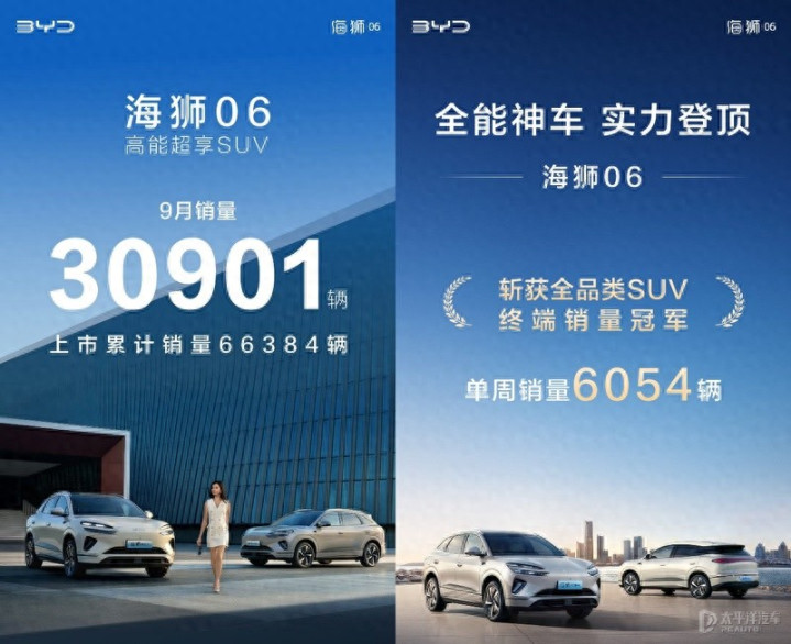 【太平洋汽车 导购频道】今年7月份,比亚迪海洋网带来了海狮06系列,这次是DM-i插混和EV纯电两个版本同时推出。值得一提的是,新车开卖没多久,就连续两个月斩获3万+辆的销售成绩,刚刚过去的9月份销量是30901辆,继续稳坐SUV车型热销榜单前列。就在10月份的第一周内,它更是以单周销量6054辆的数据斩获全品类SUV终端销量冠军。